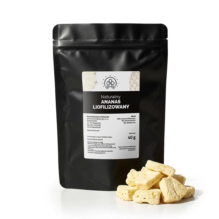 Liofilizacja to proces suszenia w niskiej temperaturze, który pozwala zachować smak, aromat i wiele cennych właściwości owoców na dłużej. Dzięki temu ananas zachowuje swój charakterystyczny smak, a jednocześnie zyskuje lekką, chrupiącą formę.
