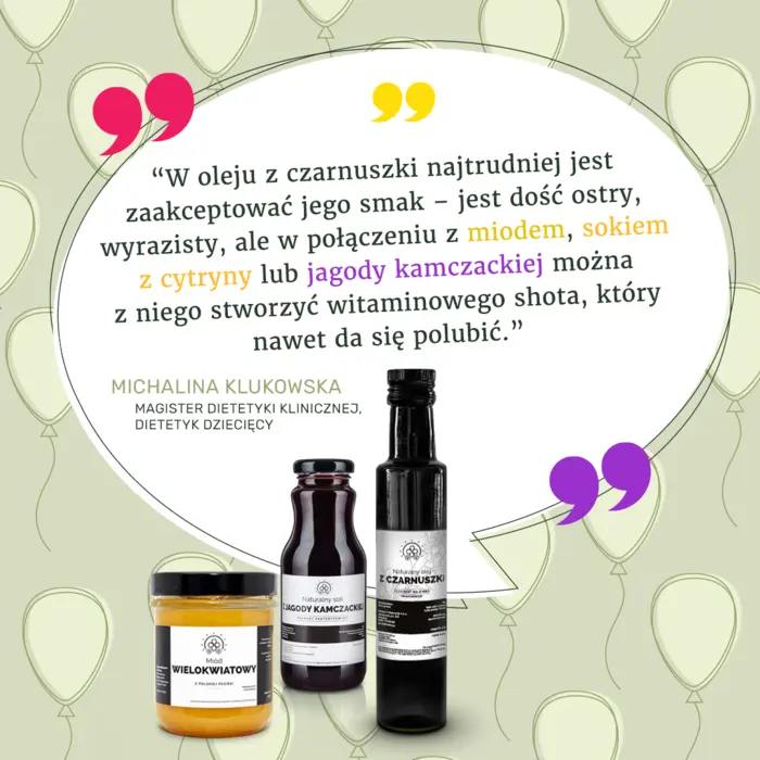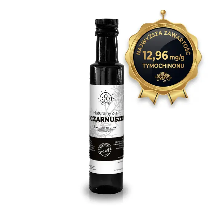 Olej z czarnuszki od Olej z natury to olej wielkiej mocy. Świeży, tłoczony na zimno ma mnóstwo cennych dla zdrowia właściwości i jest prawdziwą skarbnicą kwasów Omega, które mają nieoceniony wpływ na nasze samopoczucie. Dodatkowo olej z czarnuszki wyróżnia się na tle innych wysoką zawartością tymochinonu czyniąc go tym samym produktem wspierającym odporność. W oleju z czarnuszki najtrudniej jest zaakceptować jego smak – jest dość ostry, wyrazisty, ale w połączeniu z miodem, sokiem z cytryny lub jagody kamczackiej można z niego stworzyć witaminowego shota, który nawet da się polubić